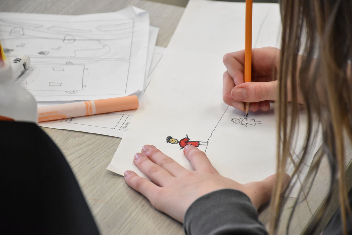 While we were there, students continued working on their sets using construction paper, glue and markers.